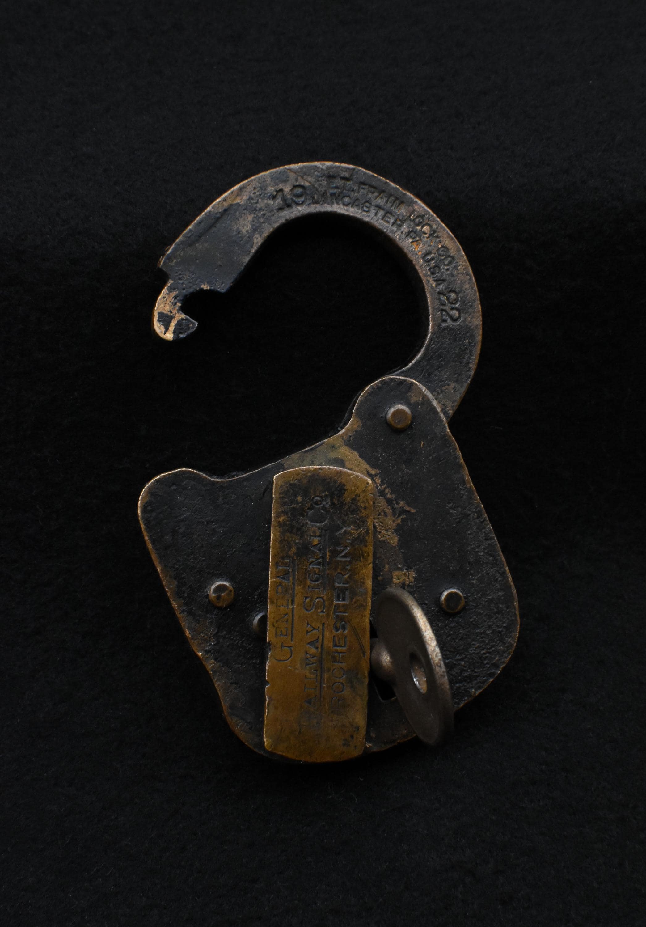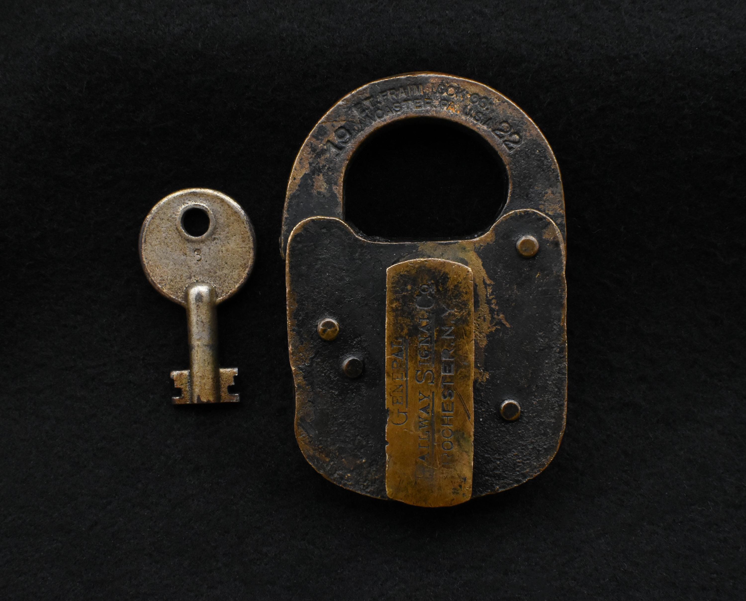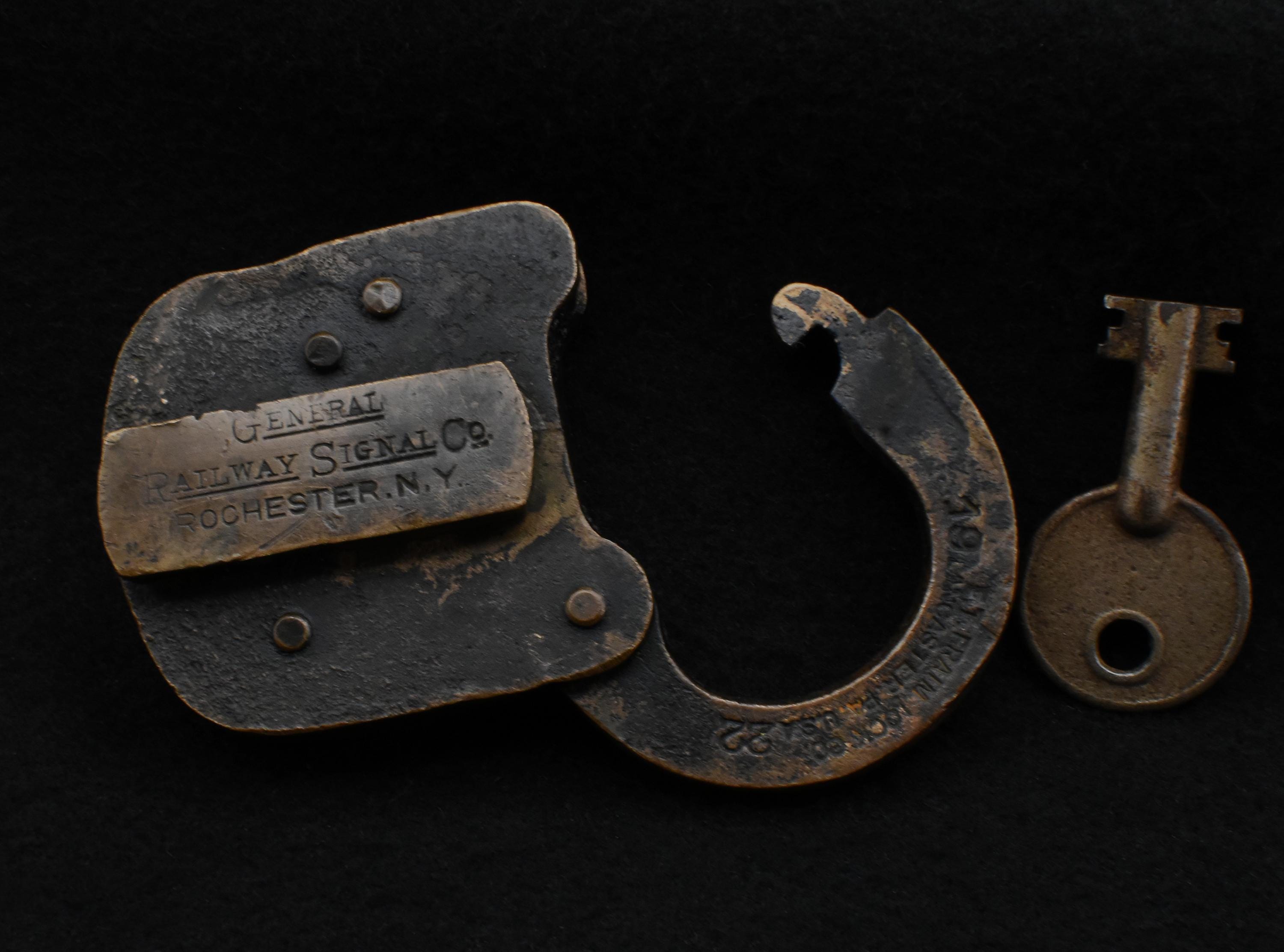 Our brass lock, although simple, is fairly rare and immensely important. Made in 1922, of brass to withstand the elements, it guarded GRS signals from unscrupulous individuals. It had only 3 keys made to ensure there were a limited number of keepers who could change the signals. It is in very good condition and shows over a century of history under that well-earned patina. The lock works, but is a tad finicky when it comes to unlocking (it could use a jiggle or two to pop open). Nonetheless, with original #3 key intact, it is a beautiful piece of American Railway history.