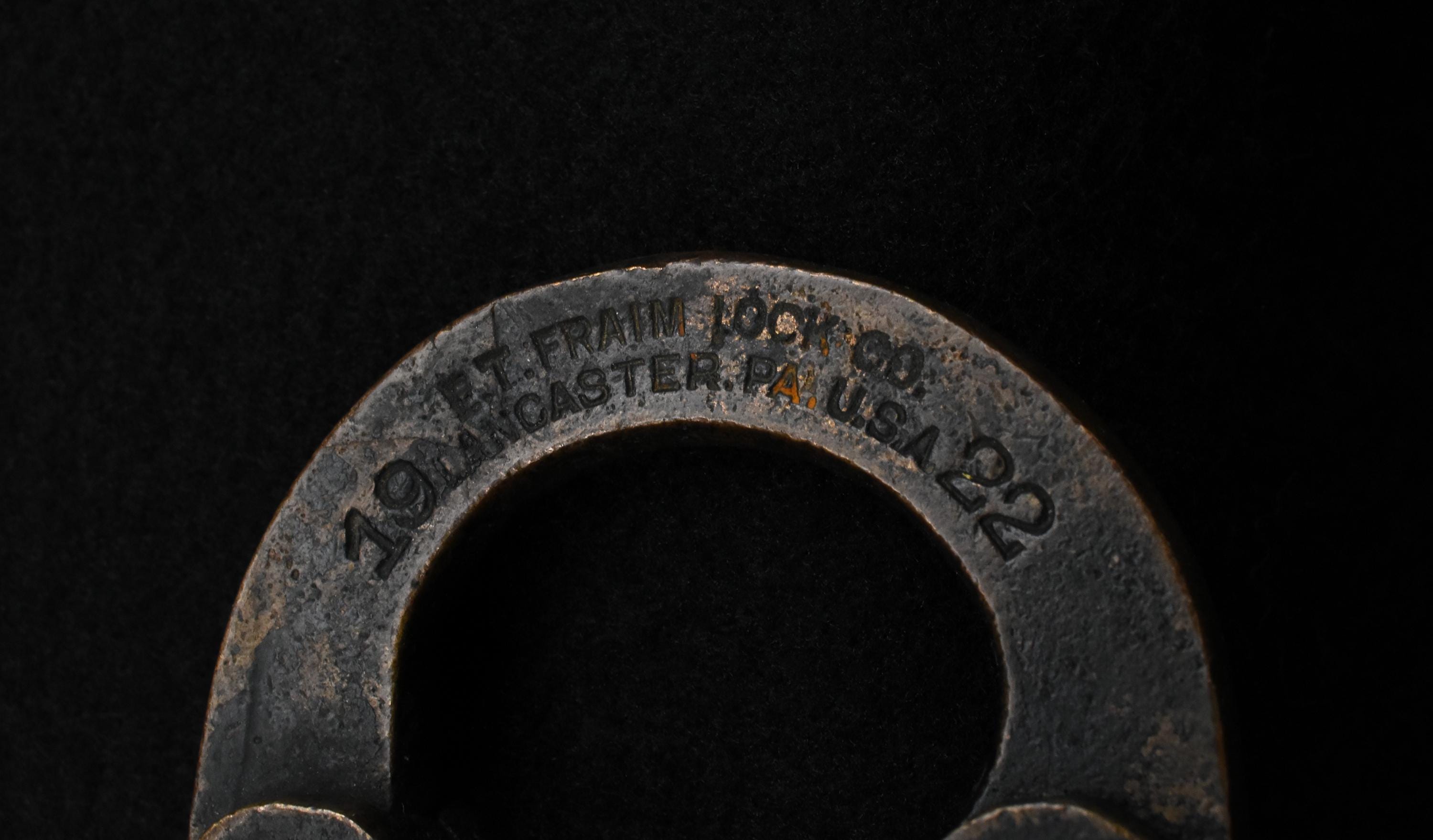 Historically, for railroads, security has always been of utmost importance. Even a single switch thrown the wrong way can lead to catastrophic consequences. As such, railroads always took great care in ensuring their locking mechanisms were sufficiently secure to deter theft and hooliganism to their signals and tracks. The pieces had to be robust enough to deal with heavy industry and all weather conditions, and would have to be universal, so any employee could unlock any of the locks along the route (assuming they had the right key). This particular lock is a signal lock - it guarded the controls for an interlock system. In North America, there are a set of signaling appliances and tracks interlocked together, sometimes referred to as an interlocking plant. These systems are designed to prevent cars from accessing tracks to which they are not meant. If a route is to be diverged or a track changed, switches would be changed prior to the signal, and without this sequence of events, a train would not be able to deviate from its course. It's basically traffic signals and gates, only for the railroad. Today, this is mostly controlled electronically, but in the first half of the 20th century and prior, physical switches and signals controlled the railroads. Their importance were such that these controls were always under lock and key. This lock was used to lock a railway signal station run by the General Railway Signal Company. Sometimes referred to as GRS, it was one of the largest companies in the US. Founded in Rochester, NY in 1904 through the merger of three separate companies, it was one of only 30 stocks listed when the Dow Jones Industrial Average was expanded from 20, in 1928. GRS trusted E.T. Fraim, one of the most storied and well-reputed railway lock manufacturers in the US, to guard their systems. E.T. Fraim Lock Company (originally known as the Keystone Lock Works) was founded in 1879 in Lancaster, Pennsylvania by three brothers - Edward T. Fraim, Parker K. Fraim and Miller W. Fraim - and quickly grew to one of the largest manufacturer of locks in the country. In around 1890, Parker and Miller departed to start their own ventures, but Edward remained to keep the burgeoning business going. At one point, it was claimed that Fraim was the single largest manufacturer of locks under one roof, in the world! In 1917, Edward passed and his sons Samuel and Walter stepped in to run the company. In 1920, Samuel bought out Walter and went on to run the business alone. However, in a cunning act of skullduggery, Walter bought a major interest in Slaymaker Lock Co, and formed Fraim-Slaymaker Hardware Co. This was in direct competition with brother Samuel's company! It made no difference, however, as Samuel's business far outpaced his malevolent brother's. Samuel's oldest son Samuel E. joined Fraim in his father's business and Edward T. Fraim II followed, in 1933. The lock company ended in the late 50s, when it was sold to the Safe Lock & Hardware Company, also of Lancaster.