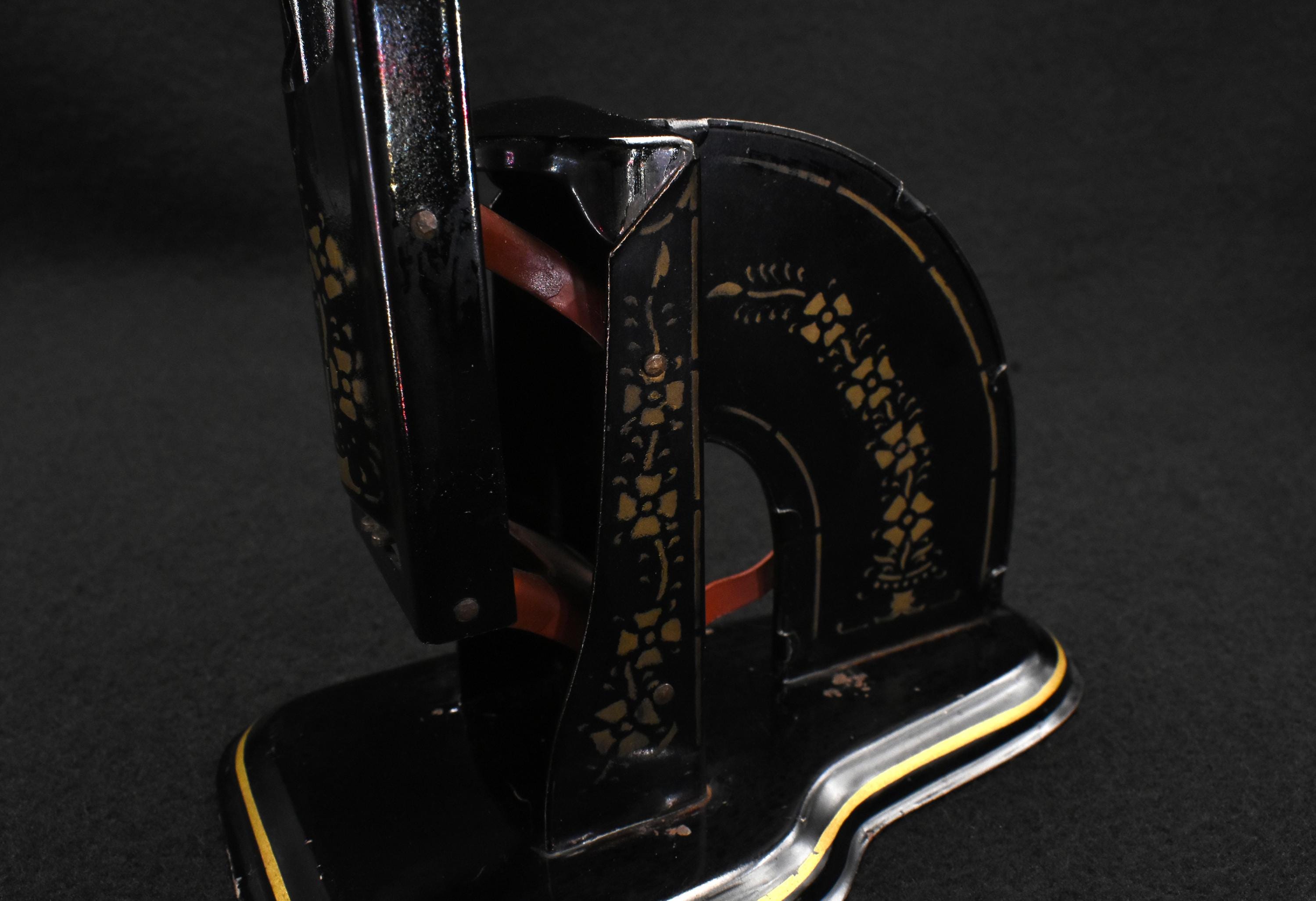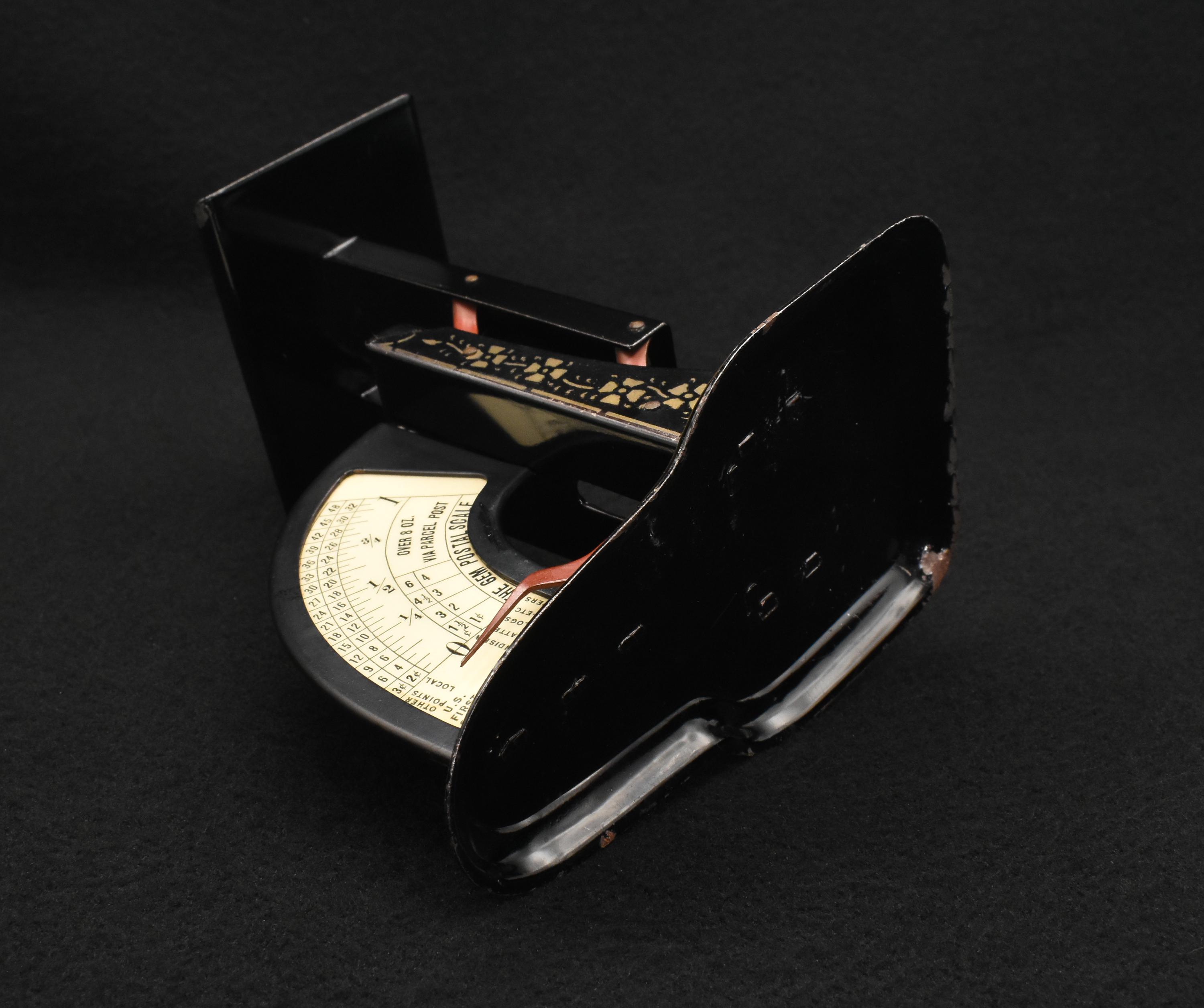 There were several companies instrumental in providing consumer-oriented spring scales for the up-and-coming business, starting as far back as the 1830s, but this particular example comes to us from a well-known maker of the early-20th century - The Triner Scale and Manufacturing Company of Chicago, Illinois. It was started in 1902 (or 1903... things are a touch unclear as to when Triner sold his first scale) by James M. Triner. However, his patent, applied for in 1901 and granted in 1904, was never actually assigned to Triner - it was owned by The Pelouze Scale and Manufacturing Company. Pelouze had started in the late 1890s and there's some evidence to suggest Triner worked for them for several years before striking out on his own. It's all a little murky, and although a little suspicious, completely inconsequential. The subsequent success of Triner scales speaks to the ingenuity, affordability and quality of these simple scales. They were provided for sale, almost completely unchanged, until the 1940s. Mainly, Triner sold 4 models of scales (the following examples reflect pricing in 1906): The Reliance – it had a half-pound capacity and cost $0.75, The Gem – one pound capacity and cost $1.25, The Ideal – two pound capacity and cost $1.50, and The Superior – four pound capacity and cost $2.00. Their designs were virtually identical, differing only in relative size and the scale of rates and weights. Their designs varied, as well, in finish. Although all made of pressed steel and painted black in a "Japanned" finish (basically a baked-on varnish mimicking enamel), some had an attractive design applied. In our case, an attractive array of gold flowers, vines and a nice pinstripe adorn the entire exterior. The needle and moving components of the weight are painted an attractive red, as well. The face of the scales, showing the weights and values of related postage is a little more difficult to comprehend. We'll gloss over the fact that there is no mention of Triner Manufacturing anywhere and instead highlight the almost incomprehensible values shown on it. There are several lines of arced values, only some of which have any symbols or indication of their correct titles. In fact, the smallest arcs show the "¢" symbol on their lowest values and it only applies to the smallest of those arcs... it's all terribly confusing. The legend signifies as follows: