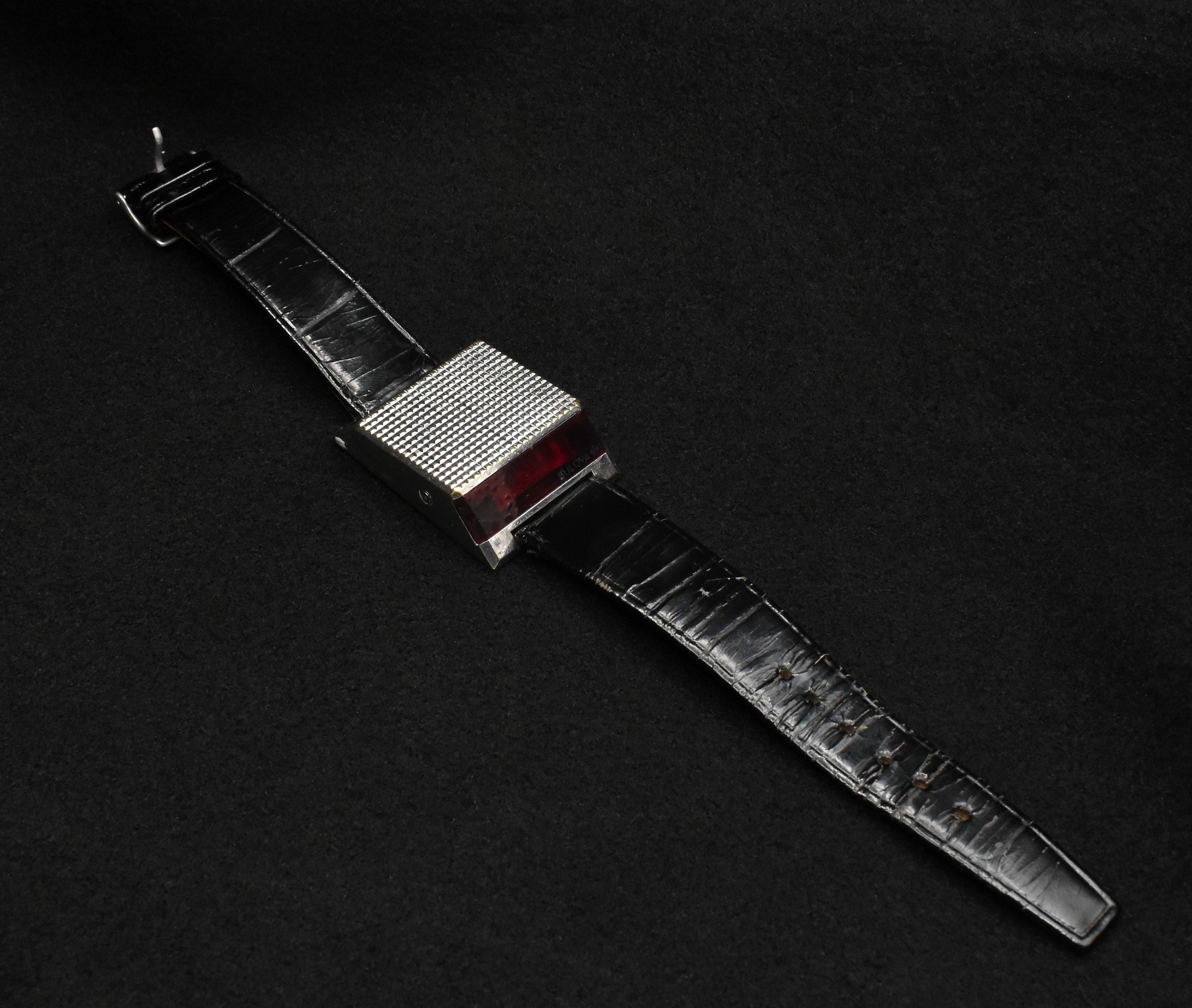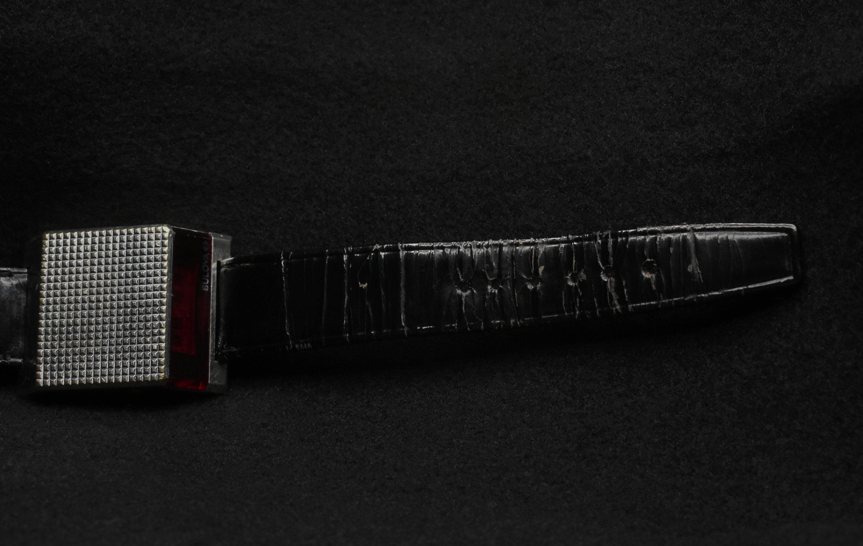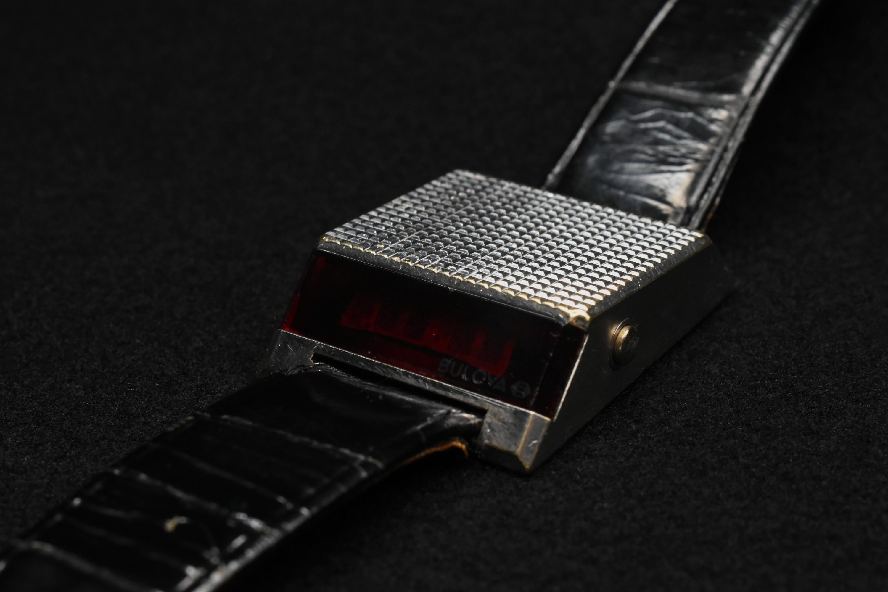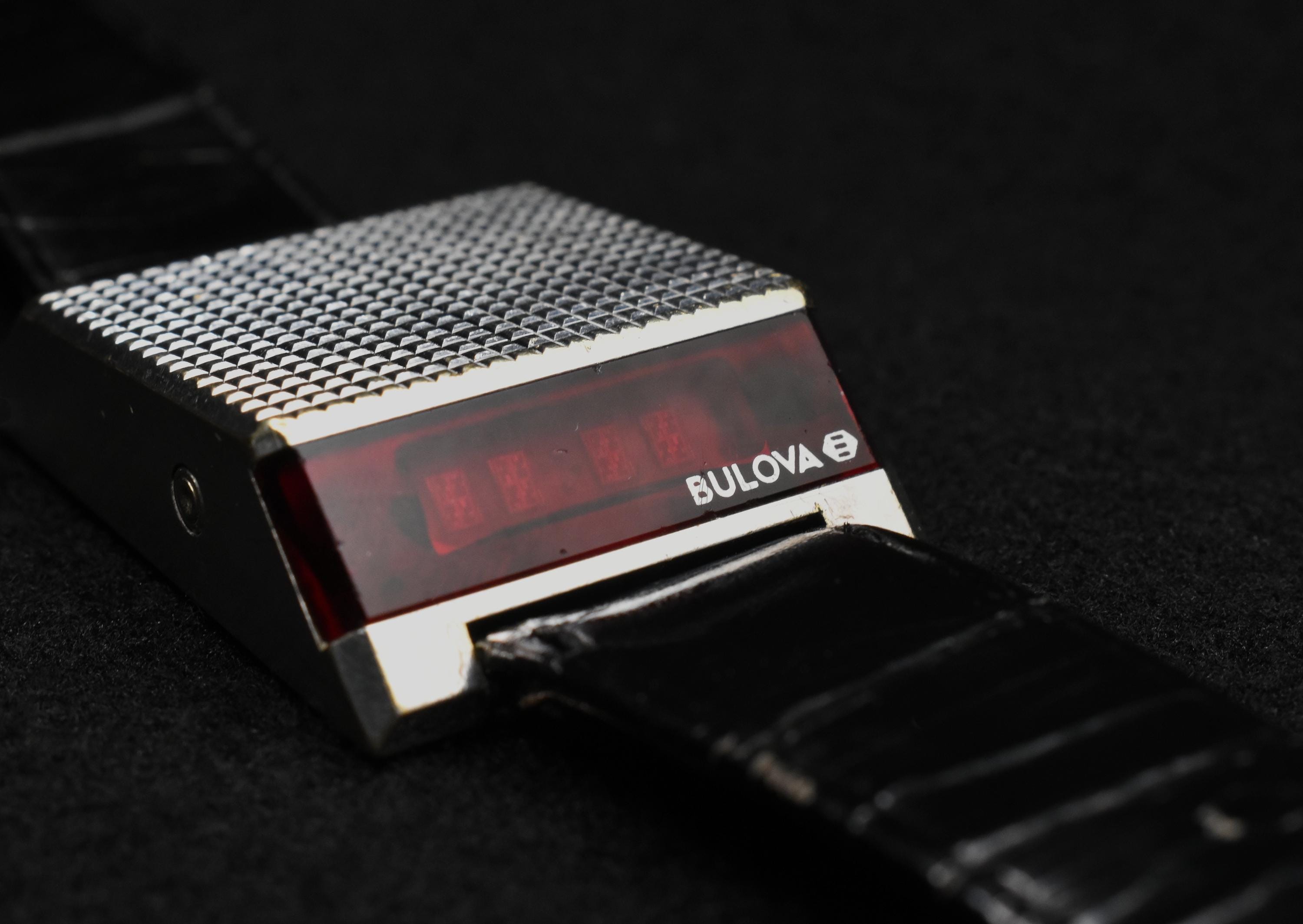 Their first massive technological evolution was with the Accutron. Bulova's "Accutron" watches, first sold in October 1960, used a 360 Hz tuning fork instead of a balance wheel as the timekeeping element. The tuning fork was powered by a one-transistor electronic oscillator circuit, so the Accutron qualifies as the second "electronic watch", following the Hamilton Electric released in 1957. Instead of the ticking sound made by mechanical watches, the Accutron had a faint, high-pitched hum that came from the vibrating tuning fork. A forerunner of modern quartz watches that also keep time with a vibrating resonator, the Accutron was guaranteed to be accurate to one minute per month, or two seconds per day, considerably better than mechanical watches of the time. The Accutron was widely advertised in the print media (including magazines like Life and Ebony) with the tagline "so revolutionary - so accurate, it's the first timepiece in history that's guaranteed 99.9977% accurate on your wrist." By 1973, over four MILLION Accutrons had been sold! It was truly a revolutionary step in watchmaking. However, the digital age was quickly approaching. Finally, the watch-wearing public was ushered into the future - the Computron. The early-70s, in Switzerland, is referred to as the "Quartz Crisis." The long-used physical nature of watch components was being replaced by electronic components. This overhaul was a shock to much of the watchmaking industry, but Bulova was not to be tripped-up. Bulova followed the lead of other watchmakers creating electronic quartz watches with his Accutron, but they took the first successful foray into all-digital display and design by introducing the Computron watch in 1976. The Computron was Bulova's first watch with an LED display and first fully-digital watch. The display was angled, reportedly, to make viewing the display easier for drivers, who needn't have removed their hands from the wheel to see the time. This was hampered slightly by the button that needed to be pressed to activate the display, but we can gloss over that. It was a design that had never been seen before - trapezoidal in shape, with a black strip that would awaken with vivid red LED numbers and letters to show the time, seconds, date and even day of the week. It was offered for several years, almost unchanged, and would secure itself as an important step in horological history. It was such a roaring success that, in 2000, Bulova re-released the design. Bulova continued their digital development through the 80s and 90s, but never abandoned their esthetically- and technologically-superior roots. Without a doubt, Bulova is one of the most influential and developmentally significant timekeeping manufacturers in history.