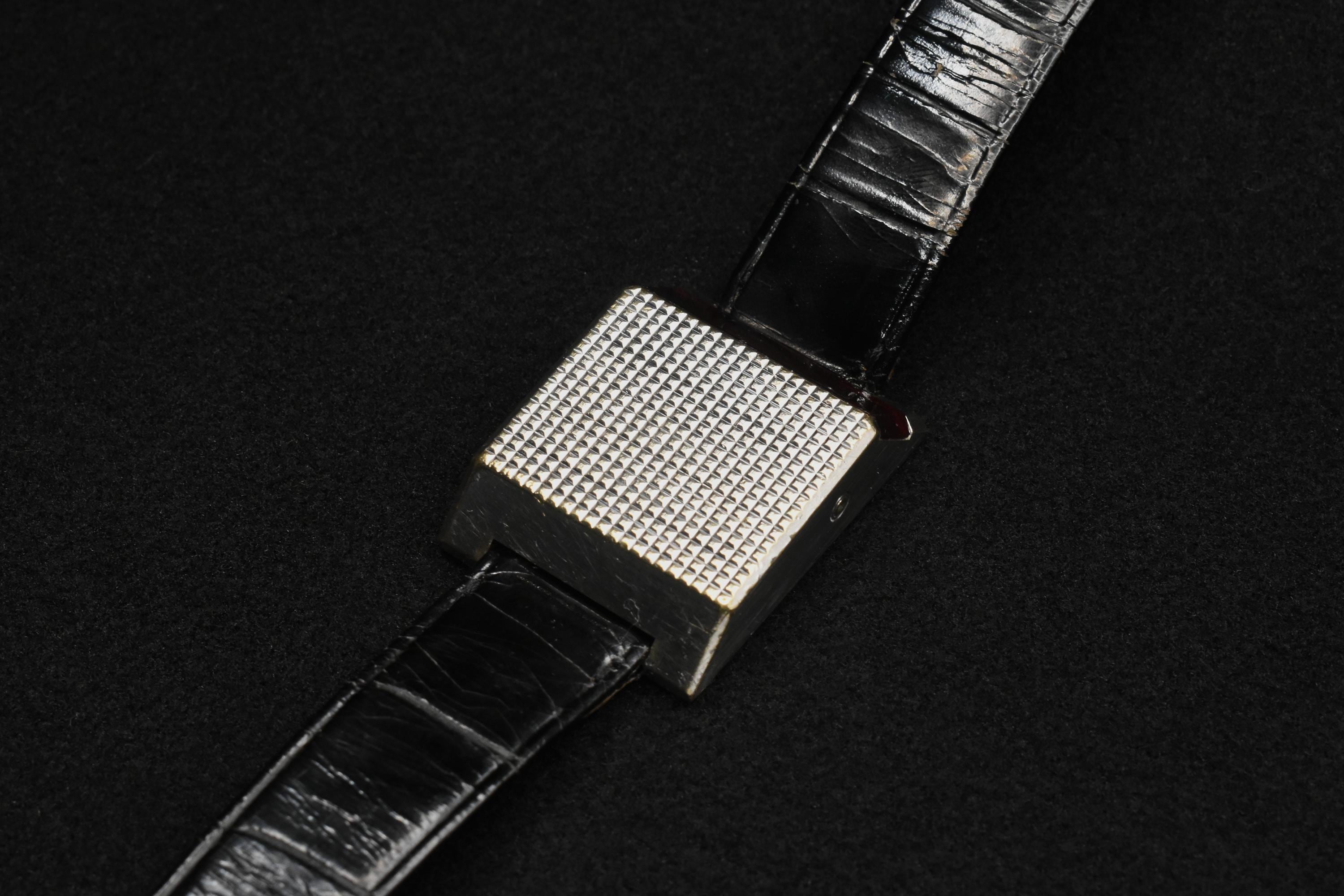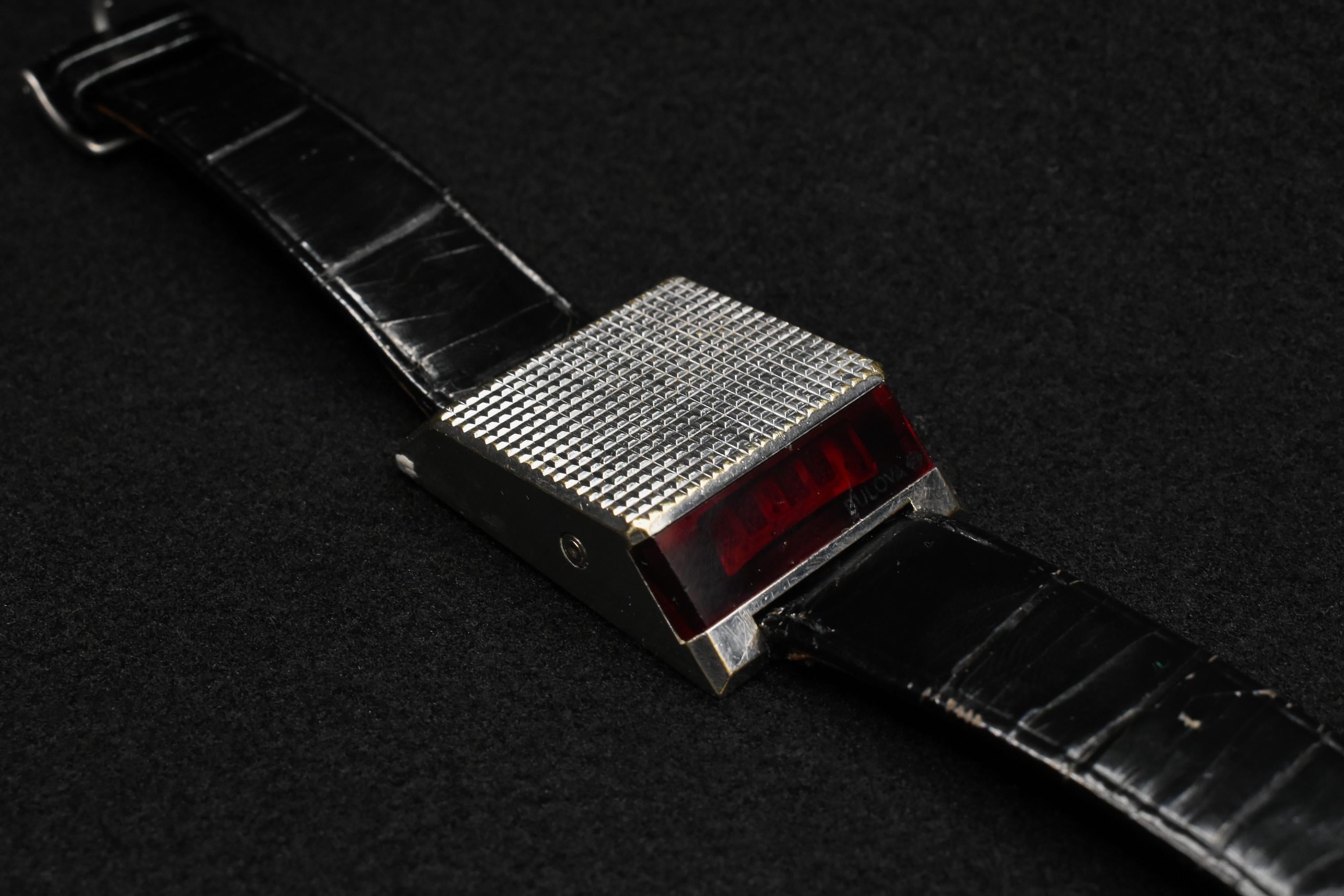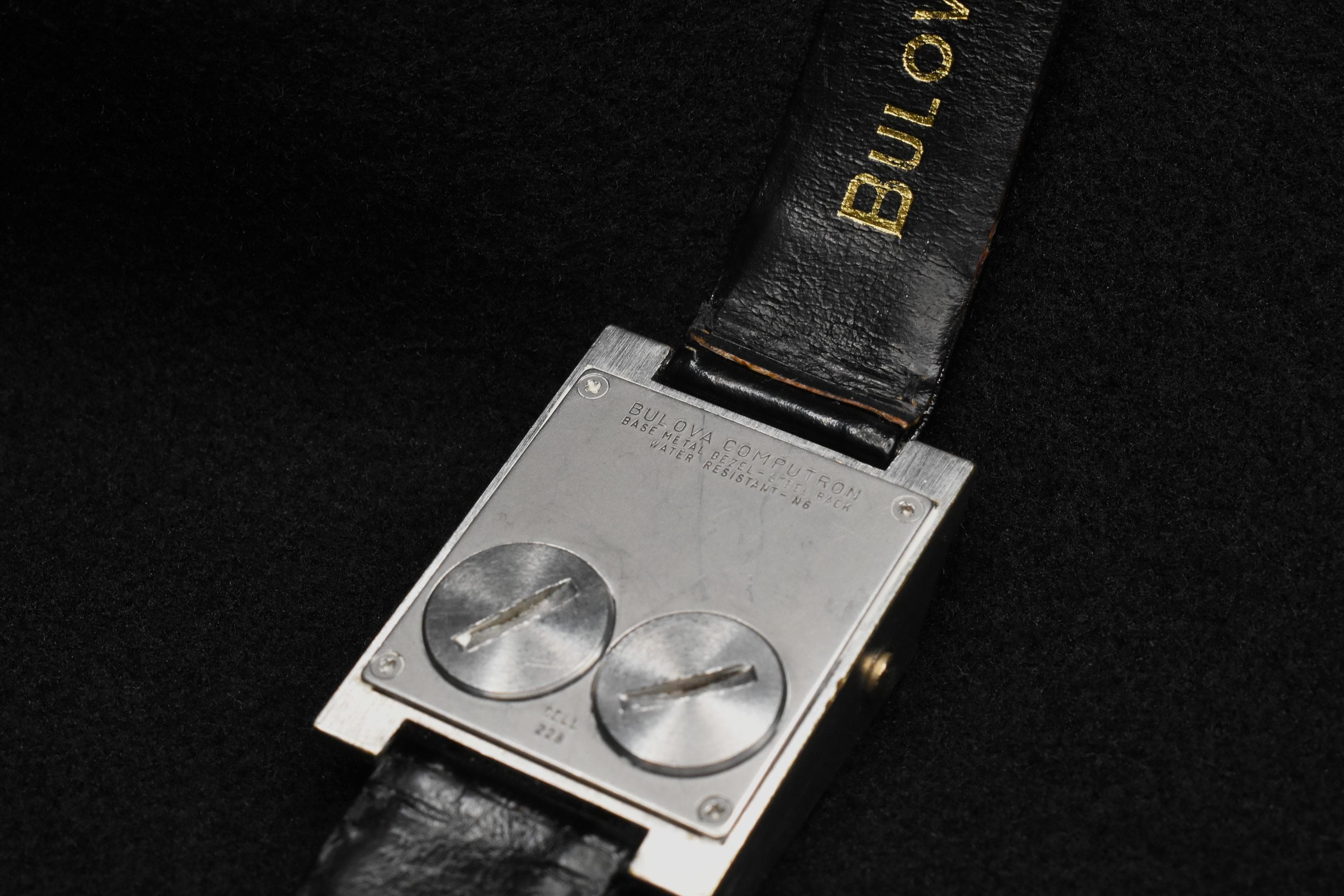 Our Computron is one of the first - the original release model from 1976. The button can be pressed to show the time, held to show the seconds, or repeatedly pressed to show the date and day of the week. It works beautifully and is structurally sound and complete. It comes with an original, leather Bulova strap, offering an elegant alternative to the often-found steel strap. Although slightly worse for wear, it is solid, complete and, as the watch, appears worse in photos than in-person.