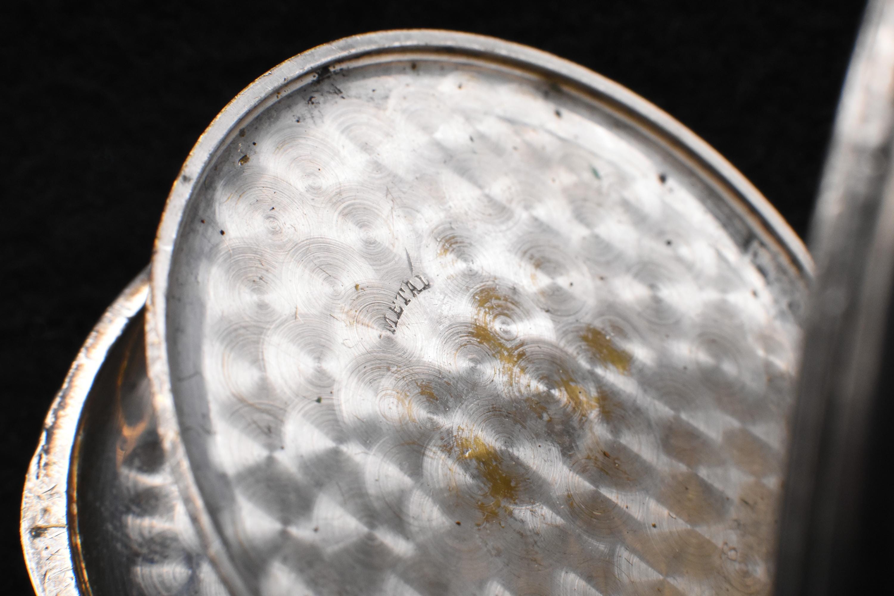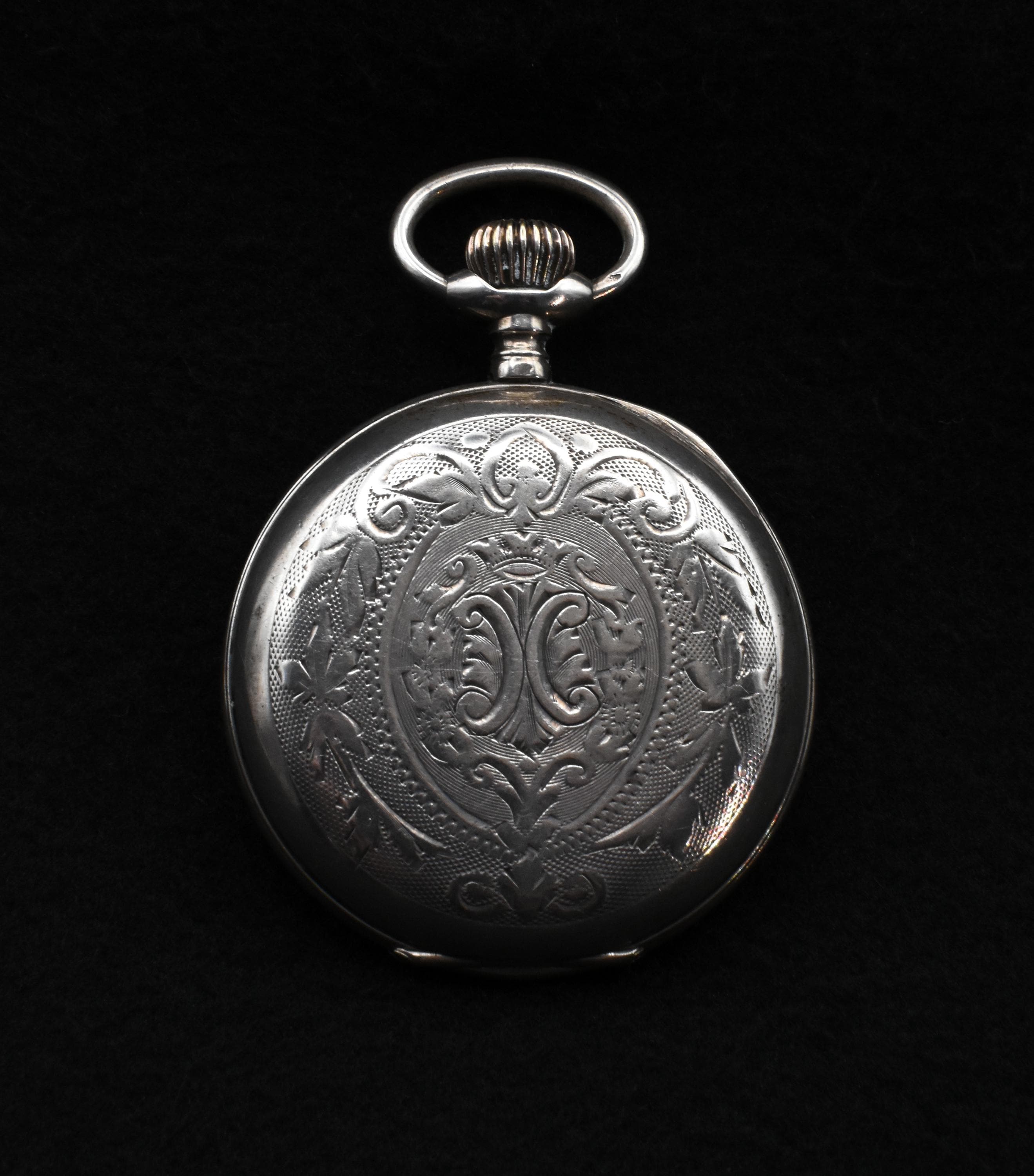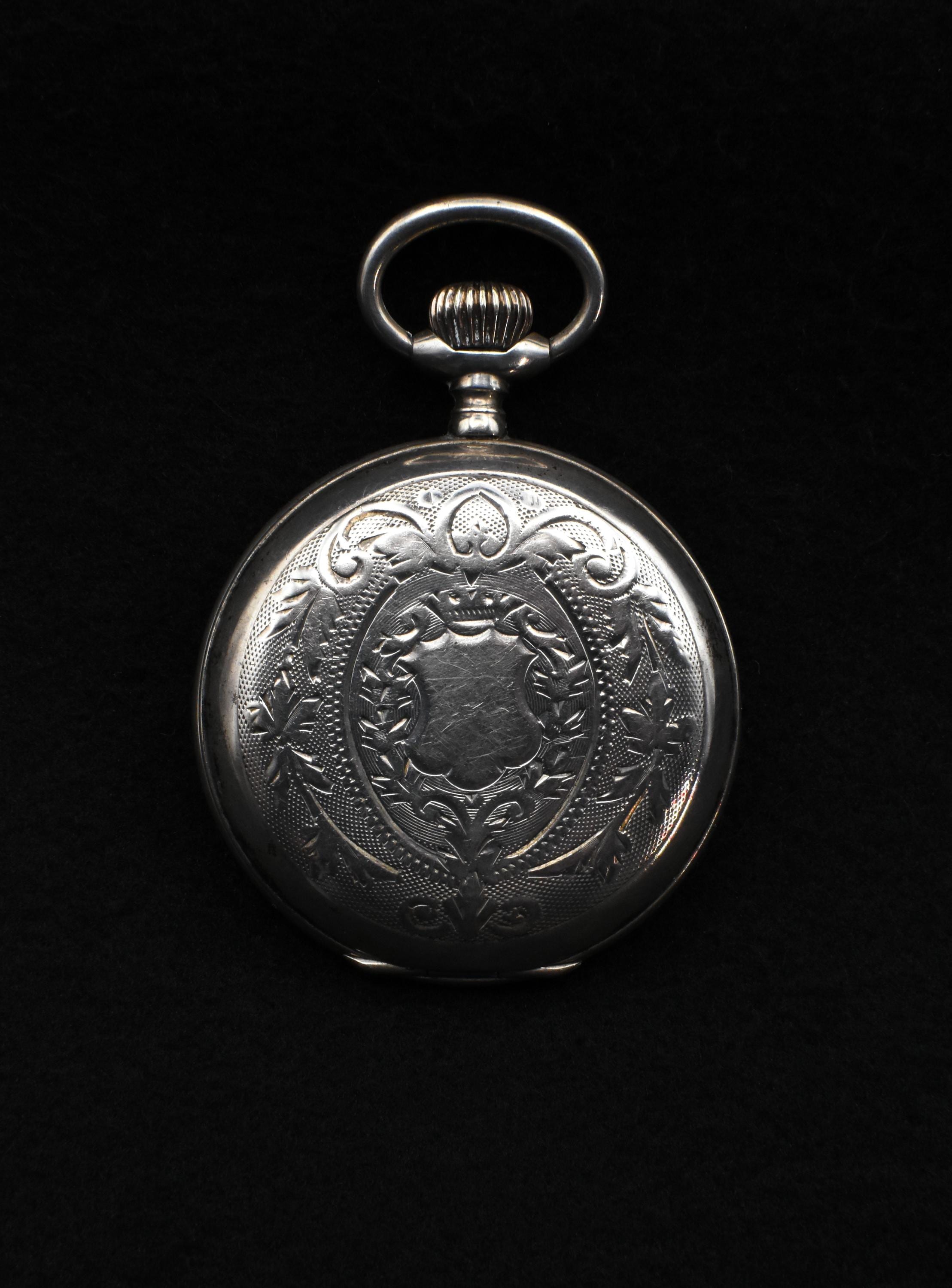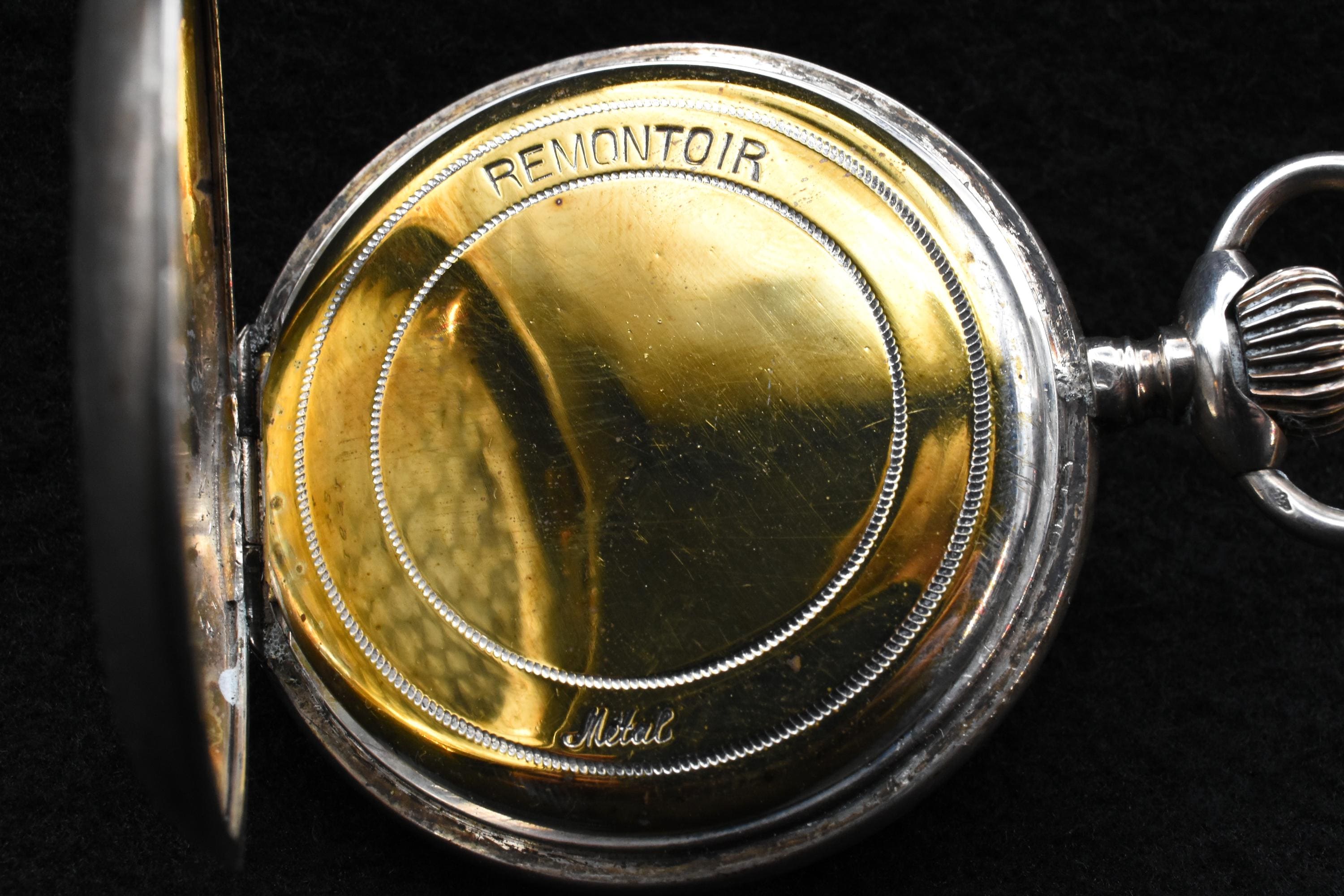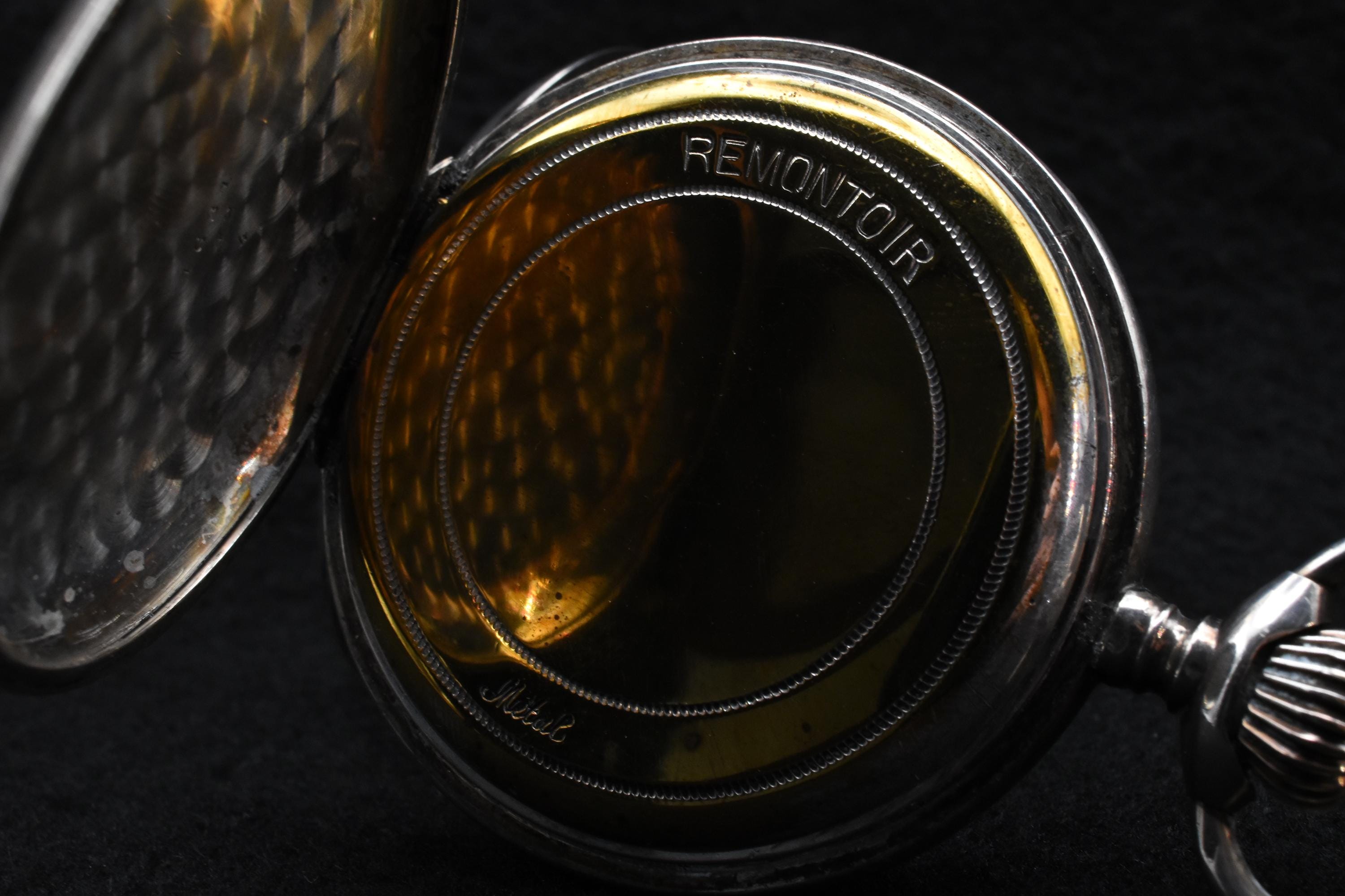 There's really not much to say, sadly. There is no maker of any kind, no serial number with which to identify the piece, nor is it made of a precious metal to which we can attribute a higher class or value of instrument. We can date the piece simply based on the design principles, following the evolution of the personal watch. The "Remontoir" label puts us firmly in the late-19th century, at least, but the "Metal" stamped on the piece shows that it is made of brass and copper, at best, most-probably nickel plated. Although made of a more cost-effective material, it would nonetheless have been a prized possession of some lucky owner... The winding crown, which doubles as a beautifully-functioning opening mechanism for the face of the watch, is located at the top, placing its year of manufacture well before the 1910s. I would assume this particular piece was designed to mimic the infinitely popular Swiss Remontoir watches, reputably some of the most desired and luxurious pieces one could purchase. The case is carved in the same fashion and of the same design as many of these more valuable pieces, but we can see a slight scuff on one of the surface covers, revealing a tiny glint of copper, underneath. Despite these revealing details, it is an admirable little thing. The interior and mechanism is in beautiful condition and it winds and ticks along merrily, keeping fairly good time, as well. The interior reveals a beautiful, burnished brass back cover to the mechanism of the watch, containing the "remontoir" moniker and the material, simply labeled as "Metal." The crown works wonderfully, both for winding and opening the piece. There is some very slight discolouration on the face, but that is to be expected from a watch that is approximately 125 years old. The intricate copper hands are clean and still keep their glow. It measures just shy of 5cm in diameter, with a total height of 6.2cm (not including the chain ring) and a depth of merely 1cm. It is a superbly built and wonderful example of turn-of-the-century engineering. It would make a wonderful addition to any collection and would even work very well as a personal watch, even today. Not bad for a 125 year old pocket watch!