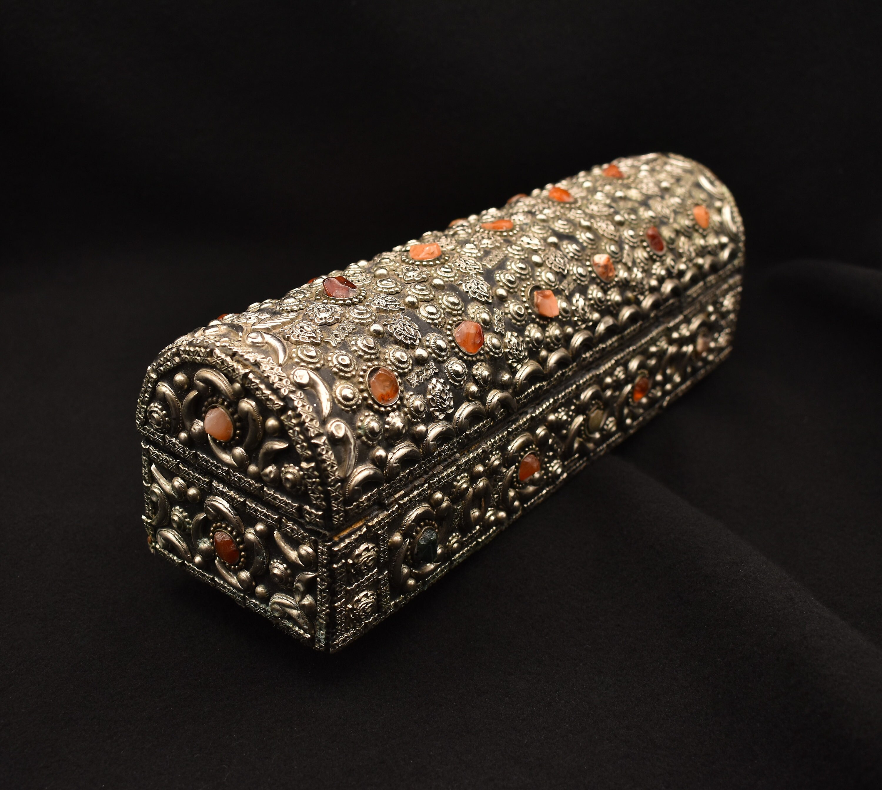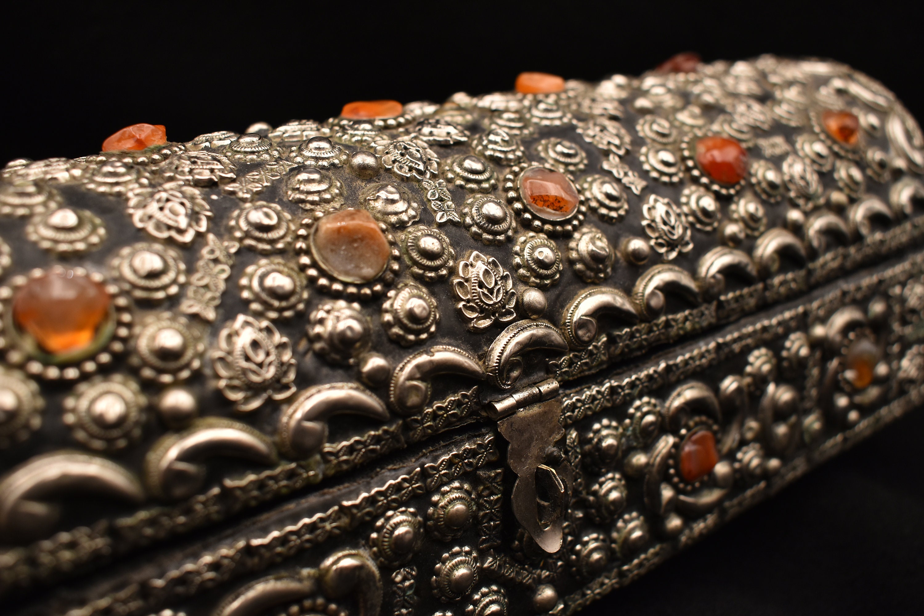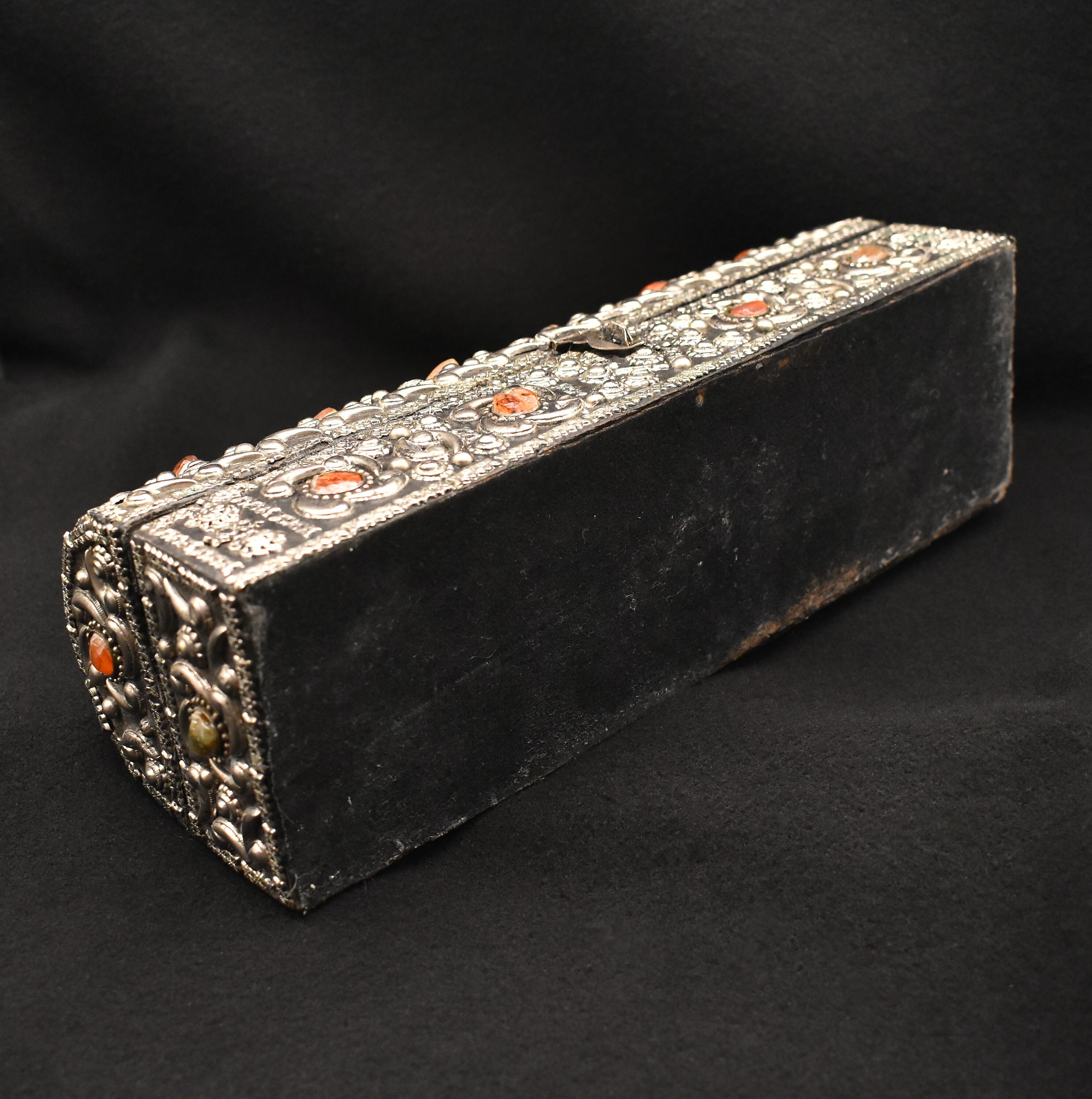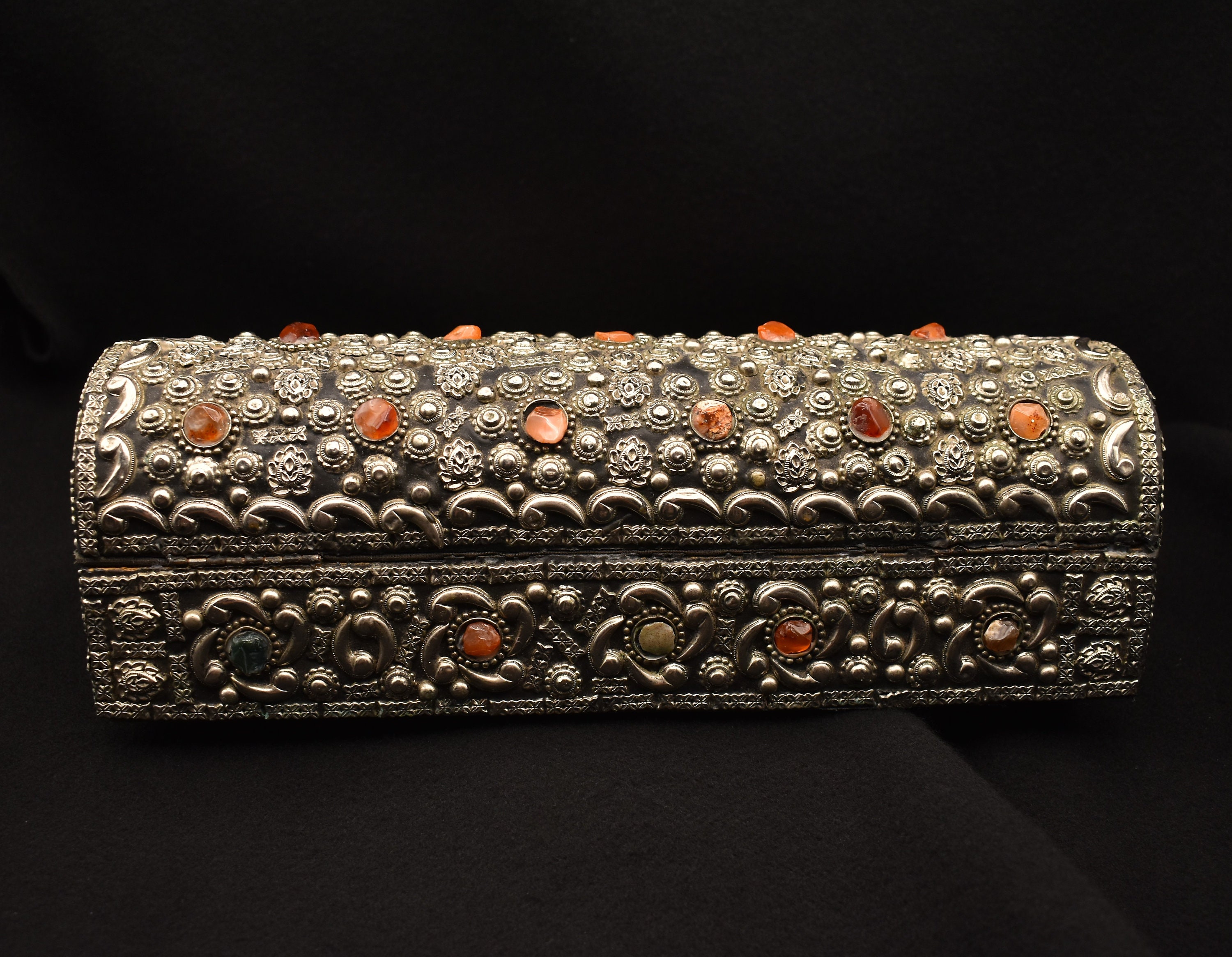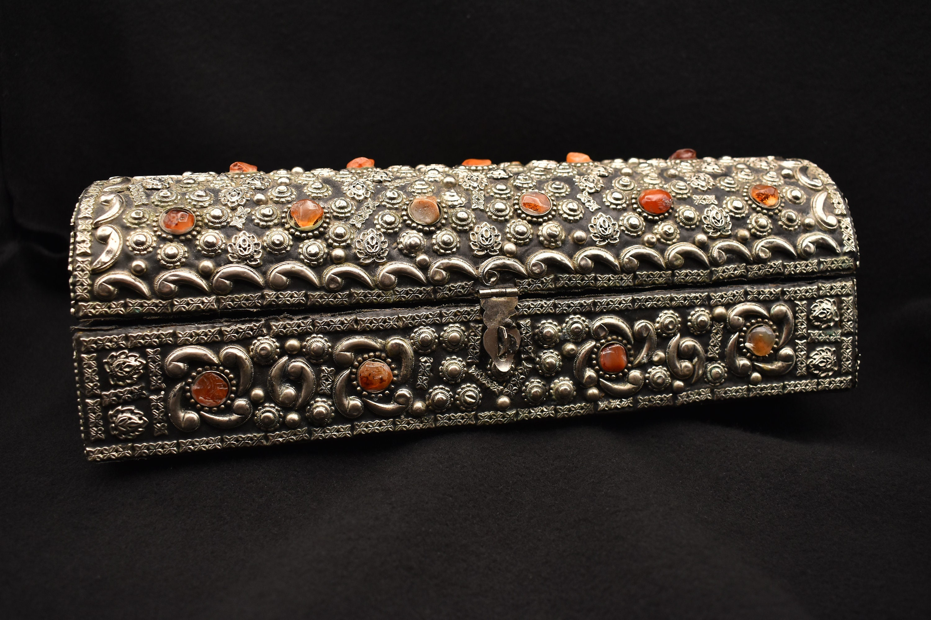 Firstly, I had to identify, concretely, the materials used for the construction. All the metal you see on the exterior is actually silver. It's not Sterling, or anything (it tested positive at about 60% silver), but I was baffled to have stumbled across this precious metal adorning what I had assumed was simply a tourist piece. I knew then, that this was not just a trinket or souvenir - it truly is a special box. The body is made of wood and is constructed very soundly. The bottom and interior is lined with hand-cut felt (or similar material) and save for some fluff and slight dirtiness, the interior is in excellent condition. The base felt is in good shape, but slightly more worn (it has been sitting on that fabric for the better part of a century, after all). In places, you can see it has been inlayed with semi-precious stones. Identifying these stones, I knew, would be paramount for proper identification. They are raw and roughly cut, and as such, the colours vary from a cloudy orange to a deep, clear maroon and even a few green stones. My best educated guess is that these are a mixture of Garnet and Jasper, but I'm given to believe the majority of the stones are actually Carnelian. Upon identifying these stones and searching for various examples of their use, I came across the tradition of Moroccan Wedding Jewelry Boxes - finally, the origin of this stunning box! According to tradition, Carnelian restores vitality and motivation, it give courage and promotes positive life choices - the perfect spirit in which to gift such a beautiful box for a loved-ones nuptials. Carnelian was popular even in ancient Egypt, as many pieces of royal jewelry have been found to contain this particular gemstone. As such, it is, in my educated opinion, the ideal candidate for these stones. Amazingly, and incredibly rarely for truly antique Moroccan Wedding Boxes, all the stones are present and accounted for! The wood looks to have been coated with a resin of some sort, prior to the application of the silver adornments and is still in excellent condition.